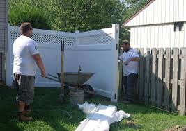 Post-holes. A small crew should start by digging post holes in your yard. In soft soil, hand-held post-hole diggers may be used, but most projects will use a motorized auger-style post-hole digger. It’s important to dig the posts beneath the frost line, so they won’t heave upward when temperatures dip below freezing. Once you’ve dug the holes, the fence installation crew will install the horizontal fencing material, gates, and brackets.